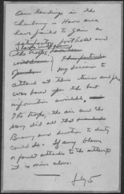 “Our landings in the Cherbourg-Havre area have failed to gain a satisfactory foothold and I have withdrawn the troops. My decision to attack at this time and place was based upon the best information available. The troops, the air, and the Navy did all that bravery and devotion to duty could do. If any blame or fault attaches to the attempt, it is mine alone.”